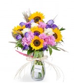 Ürün içerisinde ayçiçeği, beyaz gül , mor lisyantus bulunmaktadır.Yeşillik ve Kuru Bitkiler ile süslenerek hazırlanmıştır.