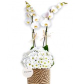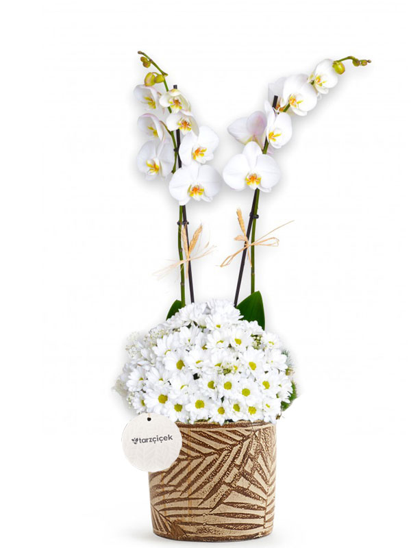 Yaprak desenli saksı içerisinde çift dal ithal orkide ve beyaz papatyalardan oluşan derlemedir.