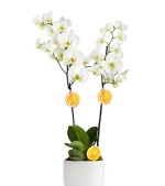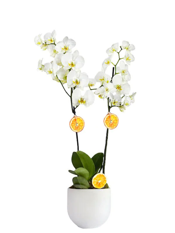 Beyaz beton saksı içerisinde 2 dal beyaz orkide ve kuru limon kabuklarından oluşan derlemedir.