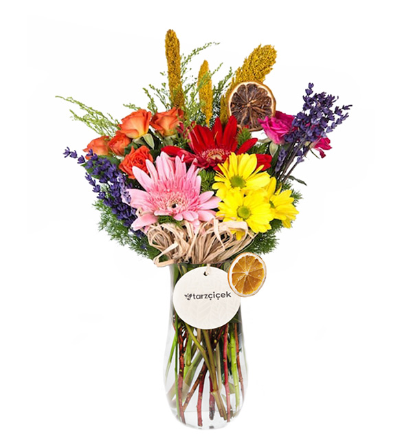 Ona karşı hissettiğiniz duyguların tek bir rengi yok! Kırmızı, pembe, sarı, turuncu, mor… Evrenin tüm renklerini size hissettiren kişinin ise tek bir hediyesi var; tüm görkemi ile Colorful Love Gerbera. Paşabahçe vazoda gerbera çiçekleri, çardak güller, lavantalar ve setteria çiçeklerinin ortaya çıkardığı bu görsel şölen, herkese iyi gelecek.