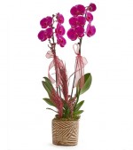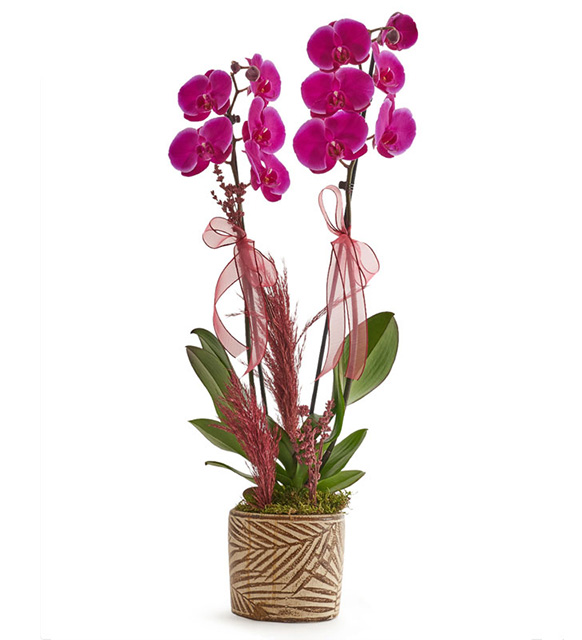 Dekoratıf saksıda çift dal mor orkıde kullanılmıstır. Kuru çiçek ile süslenmektedir.