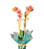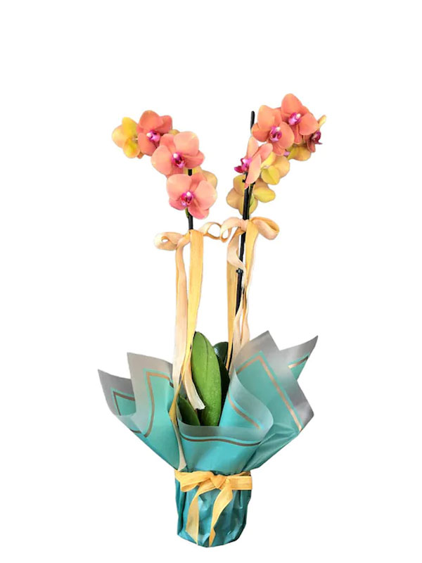 Dekoratif çiçek kağıdı ve kurdaleler ile süslenmiş Özel üretim orkide bitkisi kullanılarak tasarlanmıştır. Doğru bakım ile size ve sevdiklerinize uzun yıllar eşlik edecek bir hediyedir. Orkidelerimiz her hafta taze olarak ithal edilmektedir. Ortalama ürün boyutu 65 cm'dir.