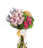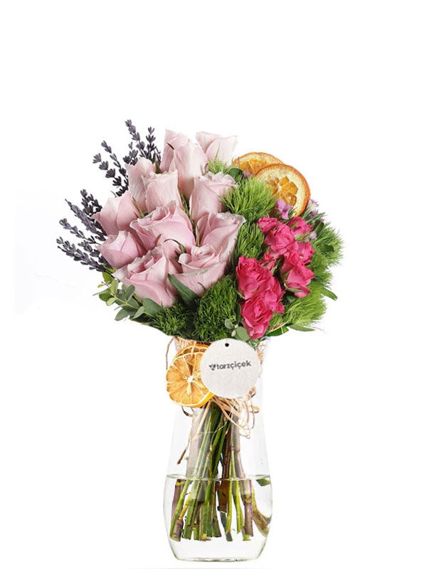 Cam vazo içerisinde lila gül ve pembe çardak güllerin muhteşem uyumundan oluşan derlemedir.
