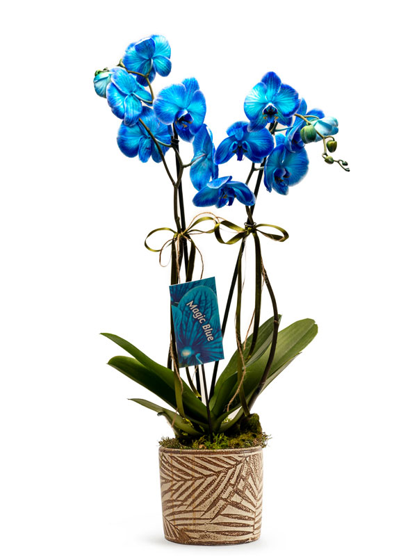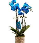 Yaprak desenli özel tasarım vazo içerisinde 2 dal mavi orkide tasarımı...