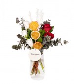 Paşabahçe vazo içerisinde 3 adet beyaz gül, 2 adet kırmızı güller ve kuru çiçeklerle hazırlanmaktadır.