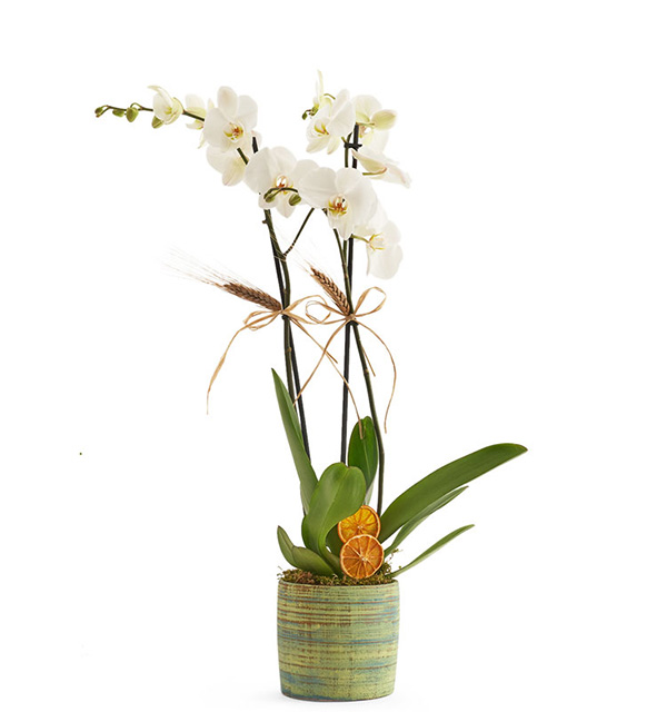 2 dal ithal beyaz orkide özel tasarım saksı içerisinde hazırlanmaktadır. Çiçekler mevsim şartlarına göre tamamen açmış ya da tomurcuklu olarak gönderilebilir.