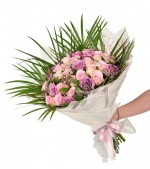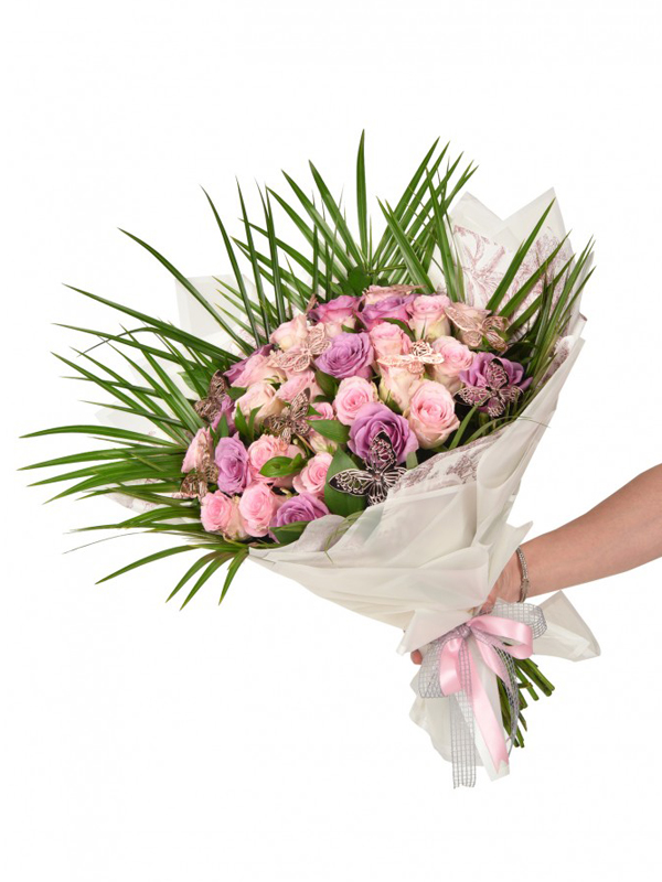 30 adet ithal pembe ve lila gül, beyaz su geçirmez çiçek kağıdı ve pelur kağıt kullanılarak hazırlanmıştır.