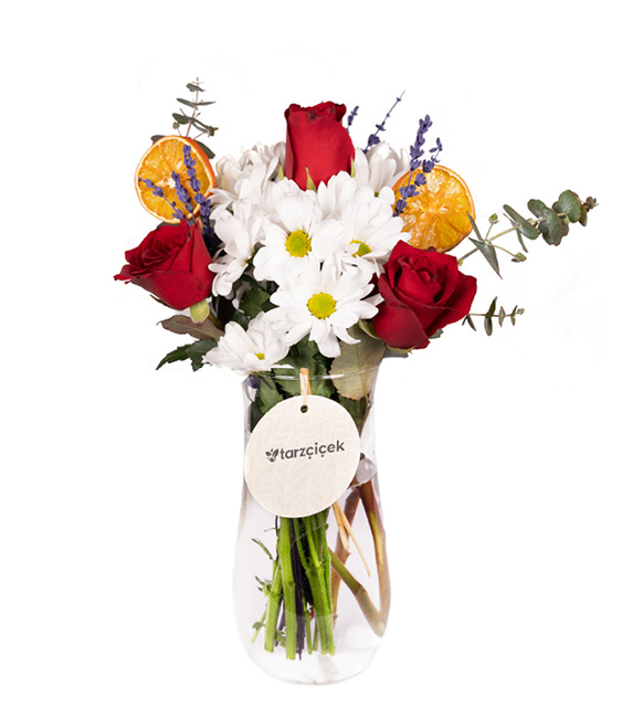 Vazo içerisinde 3 kırmızı gül beyaz papatyalar ile hazırlanmaktadır...