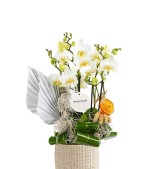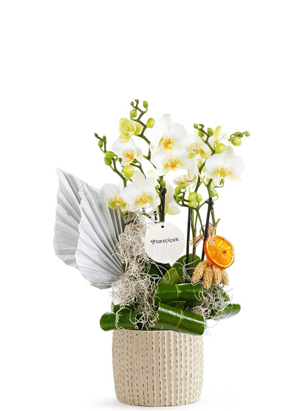 Özel tasarım saksı içerisinde 4 dal özel üretim midi orkide ve süslemelerden oluşan derlemedir.