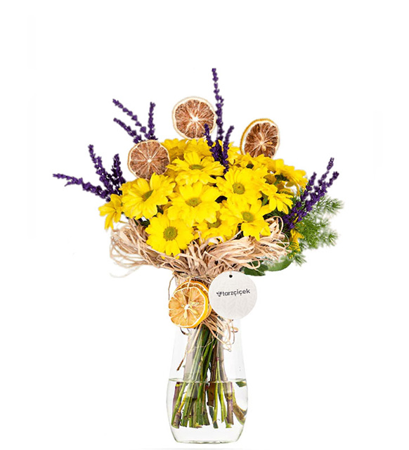 Cam vazo içerisinde sarı papatya, kuru limonlar ve lavanta çiçeklerinden oluşan derlemedir.
